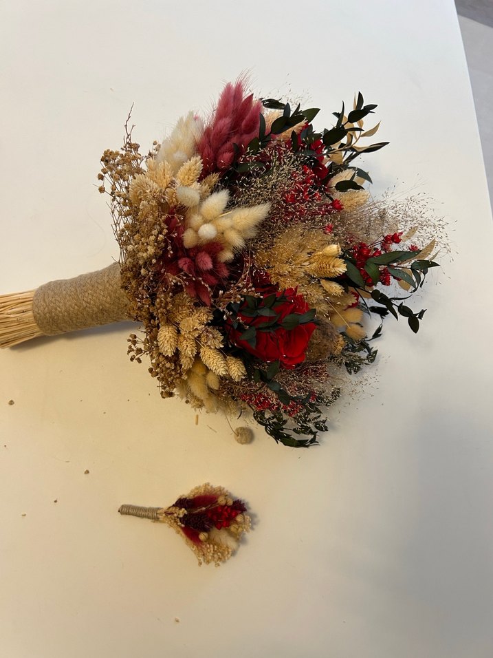 Bordo renkli, bohem tarzda kuru çiçeklerden oluşan gelin buketi, sapında püskül detayı barındırır. Retro ve hippie esintilidir. Yaklaşık 1 saat çekimde kullanıldı çekim için özel tasarlandı