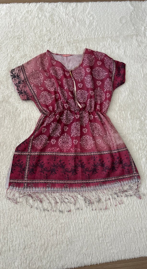 Renkli bordo plaj elbisesi, kısa kollu ve V yakalıdır. Yumuşak tekstil malzemeden, püskül ve batik desenlidir, bohem tarzındadır.