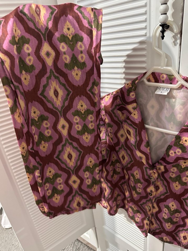 Bordo renkli, V yaka ve bluz. Salaş kesimli, bohem tie-dye desenli ve uzun boyda, günlük kullanıma uygun. İkili takım
