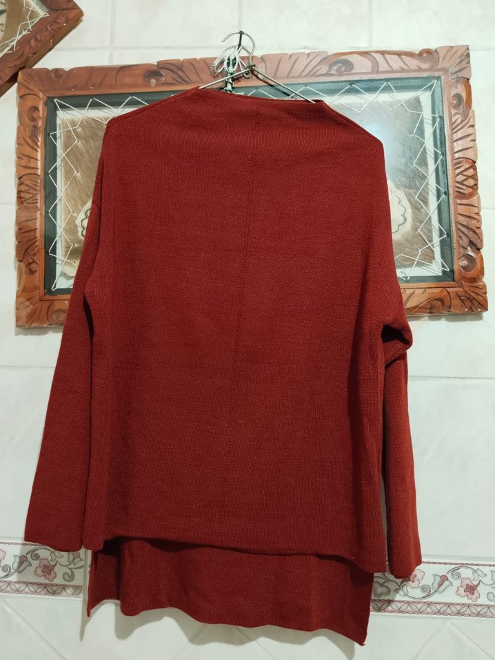 Bordo renkli, uzun kollu, yuvarlak yaka kadın kazak. Yumuşak ve sıcak örme kumaştan, salaş ve normal midi boyda, günlük rahatlık için uygun.