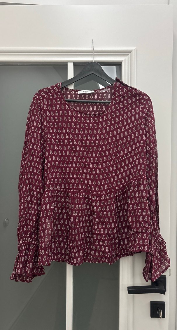 Bordo renkli, uzun kollu, salaş kesim bohem tarzda, pileli detaylı bluz. Yuvarlak yaka ve batik desenlidir, günlük kullanım için uygundur.