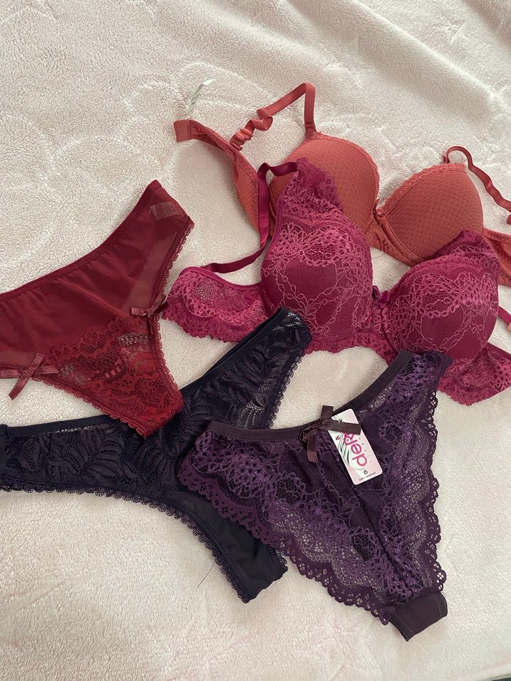 Topplu Hepsi sıfır 75 beden renkli, dantel detaylı dolgun sütyen ve çeşitli tonlarda dantel külotlardan oluşan, bohem ve rahat tarzda set.