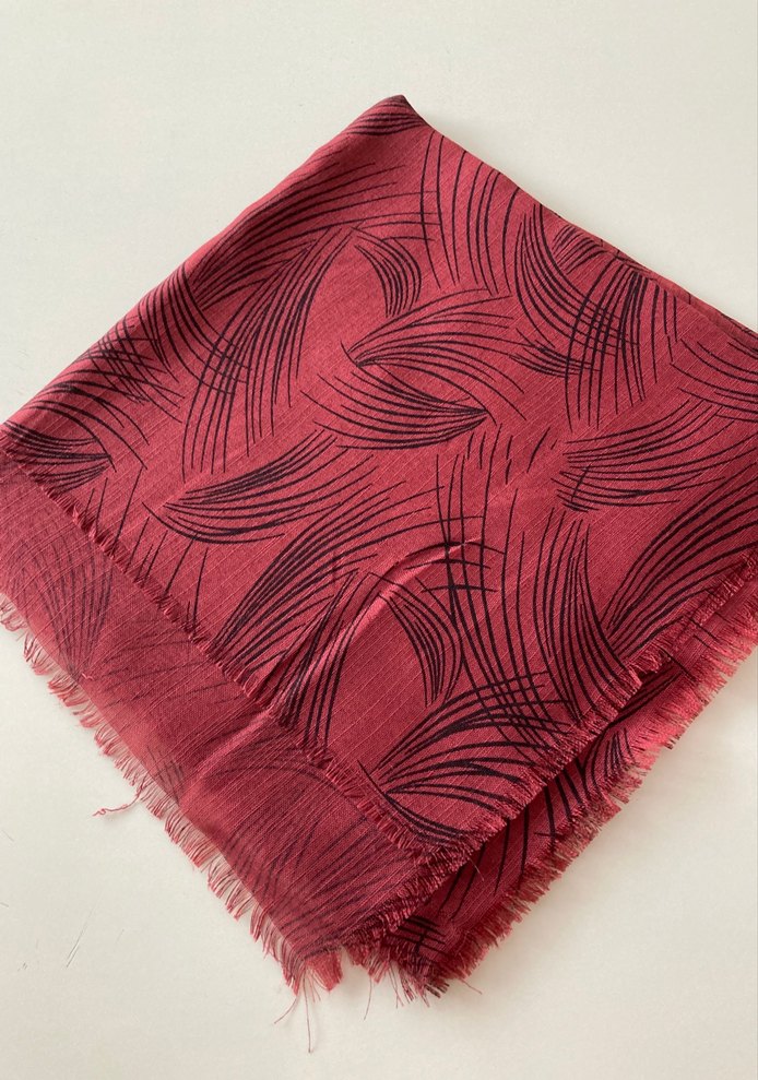 Yumuşak pamuklu kumaştan bordo renkte, drapeli ve koyu desenlere sahip bohem tarzda kadın eşarp.
