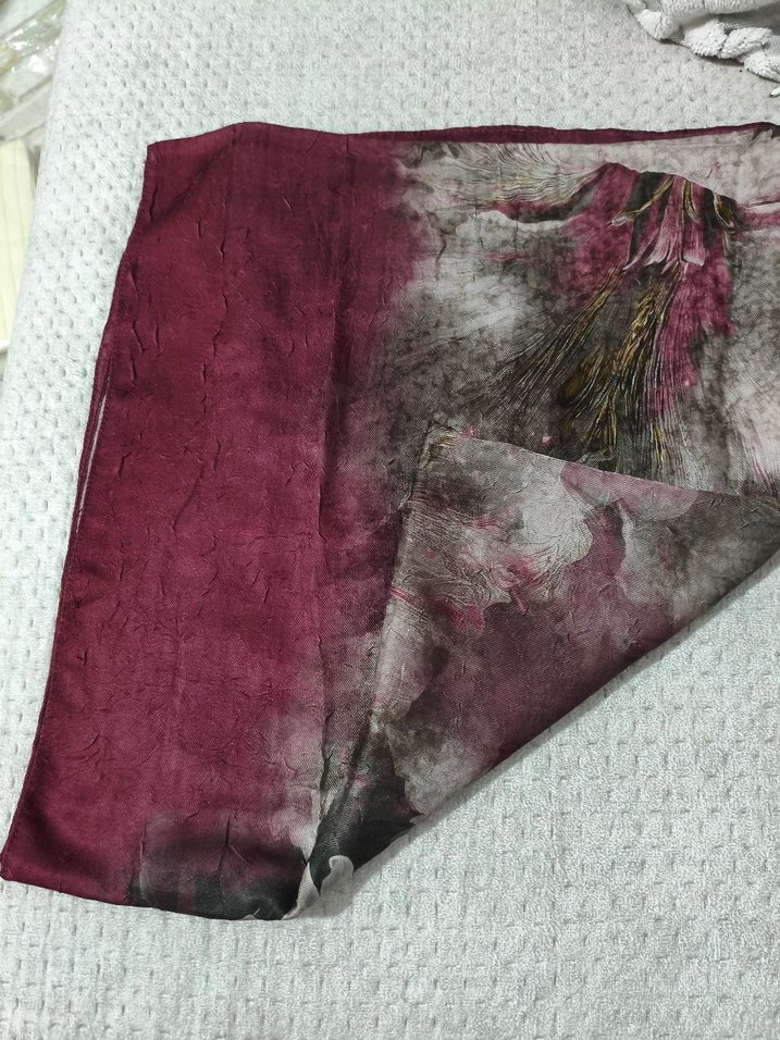 Bordo renkte, bohem tarzda, yumuşak sentetik kumaştan yapılmış, drape detaylı kadın şal