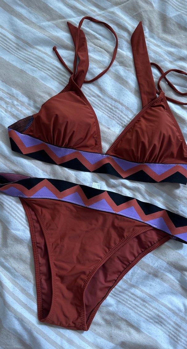 Bordo renginde, kemerli ve strappy detaylı, bohem tarzda kadın bikini. Normal midi boyda, kemerinde zigzag desen bulunur. Plaj için uygundur.