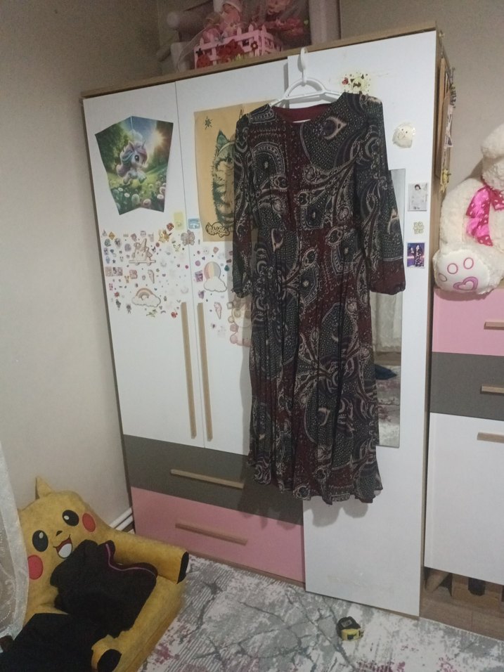 Bordo bohem tarzda, uzun kollu, V yakalı, bol kesim ve drapeli uzun elbise. Tekstil kumaştan, batik desenli, günlük kullanıma uygun.