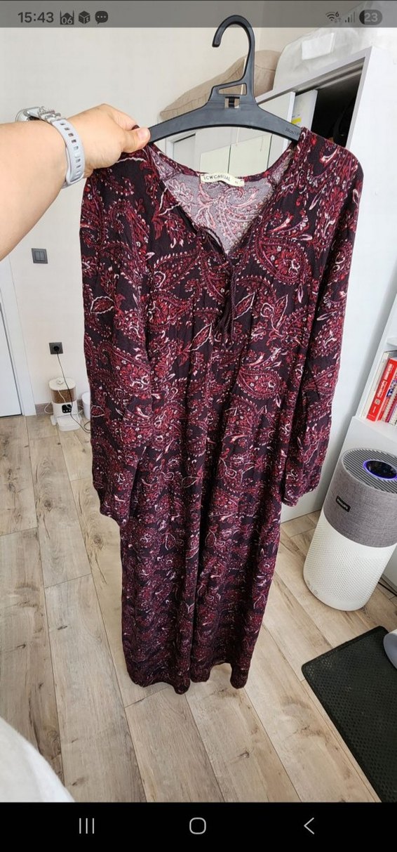 Bordo renkli, uzun kollu ve V yakalı bol kesim elbise. Koyu tonlarda batik desenli, drapeli detaylarla bohem tarzını yansıtır. Yumuşak sentetik kumaş.