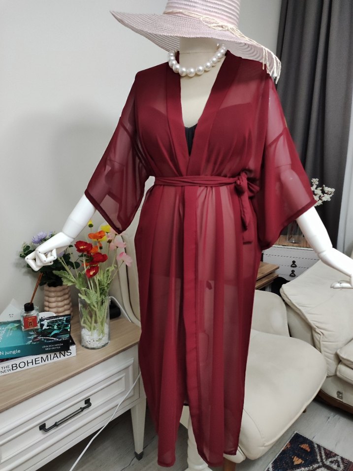Bordo renkli, uzun ve bol kesim kadın pareo Askılı kolları ve bel bağlama detayı ile bohem tarzda, hafif ve şeffaf kumaştan üretilmiştir.