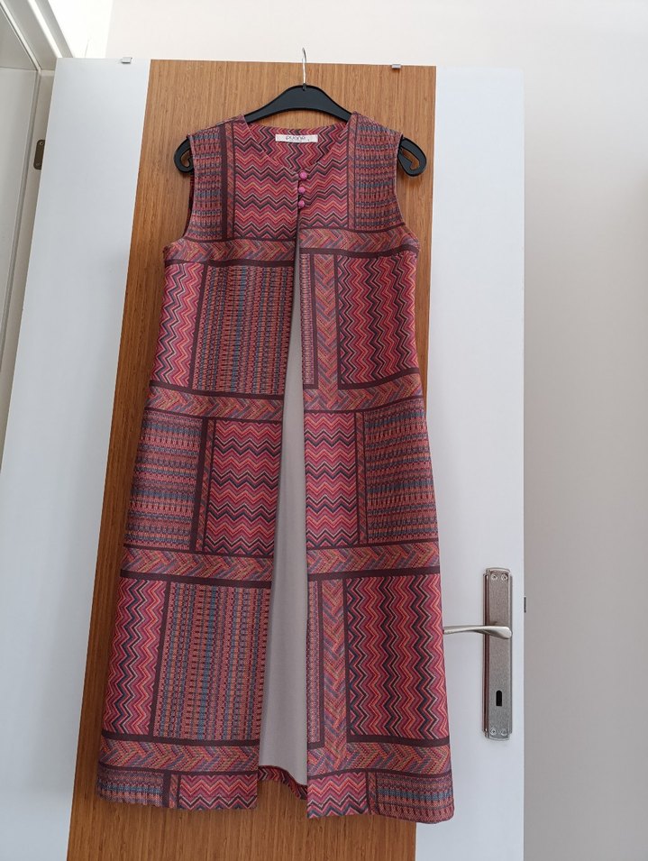 Bordo renkli, uzun boy, pileli ve batik desenli kadın yeleği. Kolsuz ve çentikli yaka detayına sahip, bohem tarz için uygun.