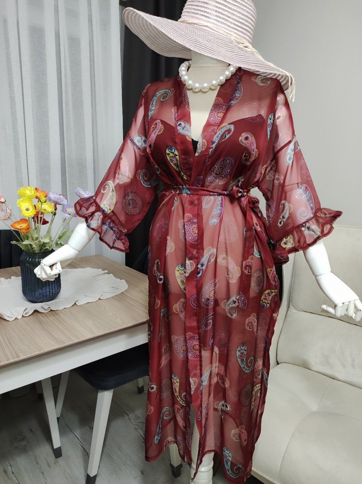 Bordo renkte, bol kesim, askılı uzun kimono. Sentetik kumaştan, renkli batik desenli, bel kemerli ve günlük kullanıma uygun.