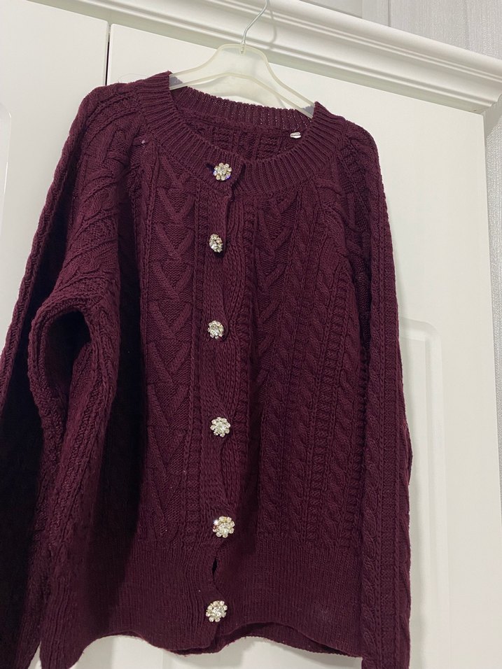 Bordo renkli, düğmeli ve uzun kollu örme hırka. Bohem tarzda, salaş kesimli ve günlük kullanıma uygun bir parçadır.
