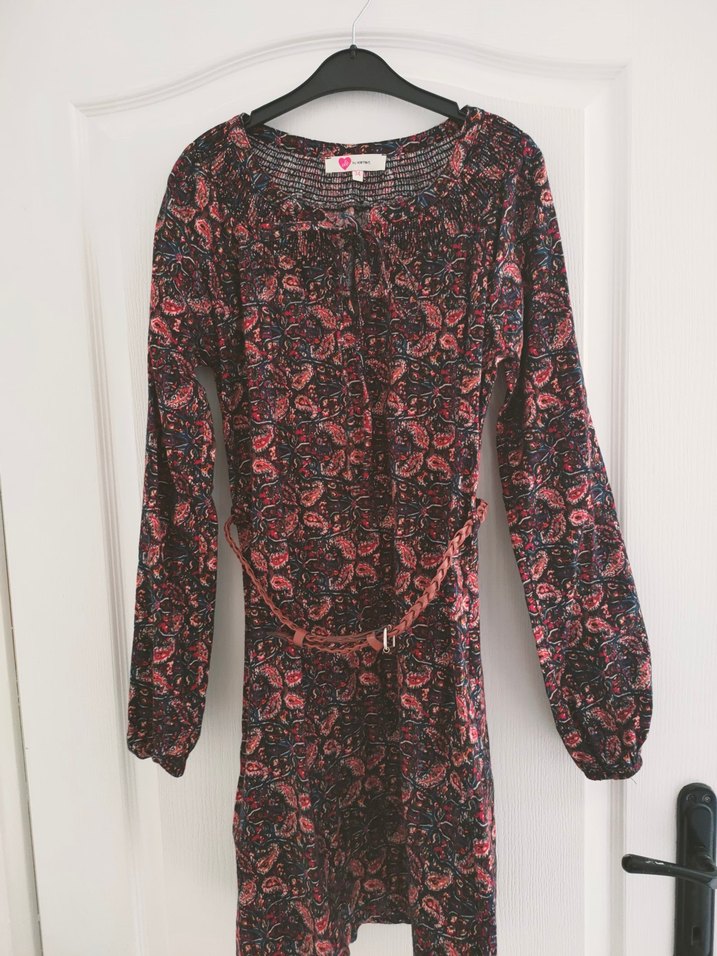 Bordo renkli, uzun kollu, yuvarlak yaka ve kuşaklı bohem elbise. Sentetik kumaştan, bağcıklı ve salaş kesim, romantik akşamlar için uygun.