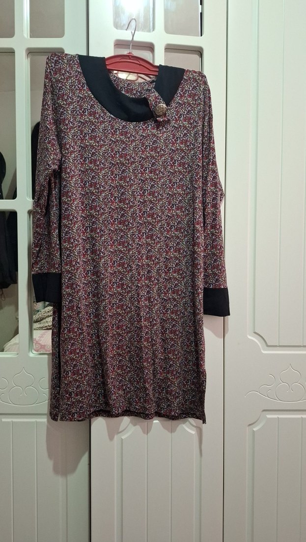 Bordo renkli, bohem tarzda, düğmeli yüksek yakalı, uzun kollu, bol kesim rahat elbise. Günlük kullanıma uygun yumuşak sentetik kumaştan yapılmıştır. eni 48 cm boy 90 cm