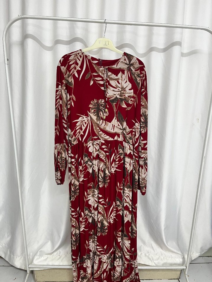 Bedeni XL-XXL ARASIDIR. Bordo renkli, salaş kesimli, V yaka uzun kollu bohem tarzda elbisedir. Drapeli ve batik desenlidir, yumuşak sentetik kumaştan yapılmıştır.