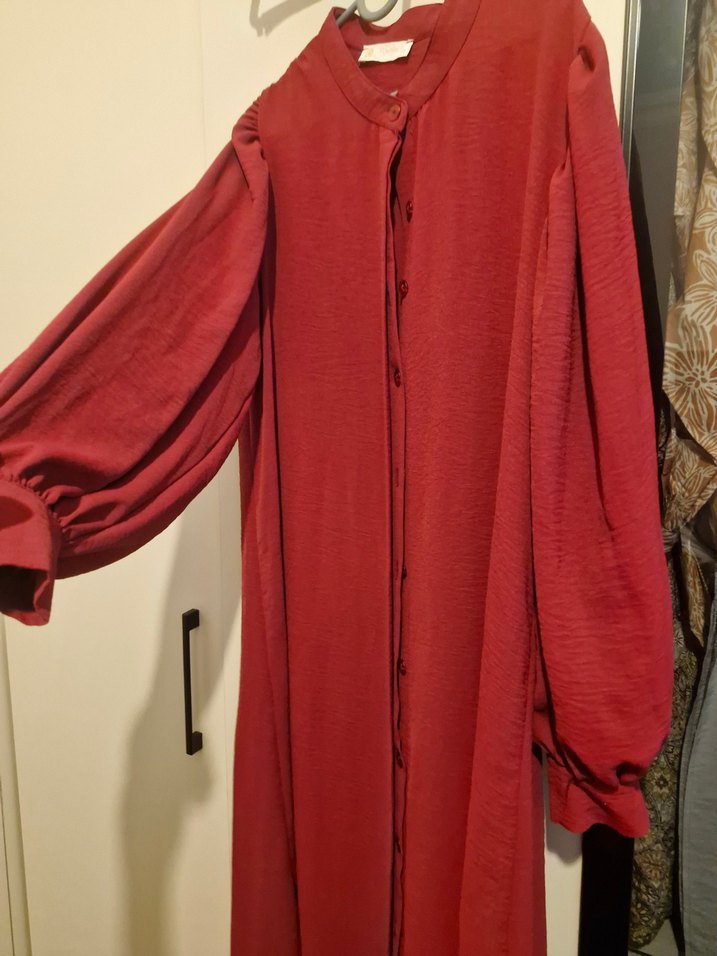Bordo renkli, uzun kollu ve salaş kesimli bu kadın elbisesi, bohem tarzını yansıtıyor ve desensiz sade bir tasarıma sahip. 3. 4 defa giyildi bol geldigi için giyemedm