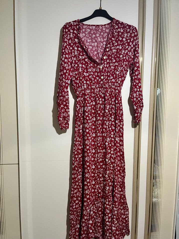 Bordo renkte, uzun kollu, V yaka ve düğmeli bohem uzun elbise. Renkli batik desenli, bol kesim ve yumuşak sentetik kumaştan üretilmiştir.