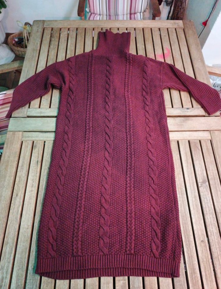 Bordo renkli, uzun ve fitted kesim kadın kazak, bohem tarzda örgü örülmüş, boğazlı ve sade desensizdir. Günlük kullanıma uygundur.