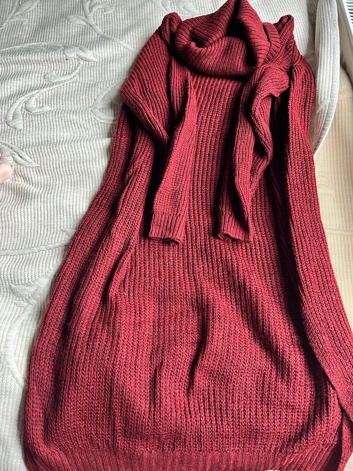 Bordo renkli, bol kesim, bohem tarzda uzun triko kazak. Boğazlı yaka ve uzun kolludur, rahat ve sıcak bir yapıya sahiptir.
