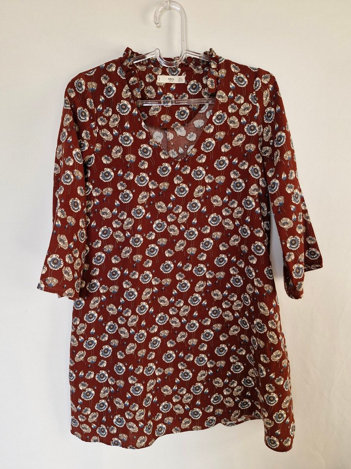 Bordo renkli, bol kesim, uzun kollu ve V yakalı hamile tunik. Düğmeli önü ve baskılı deseniyle bohem tarzda, günlük kullanıma uygun.