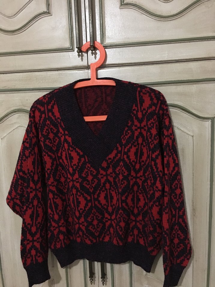 Bordo renkli, bohem tarzda örgü kazak. V yaka, uzun kollu ve bol kesimdir, günlük kullanıma uygundur.
