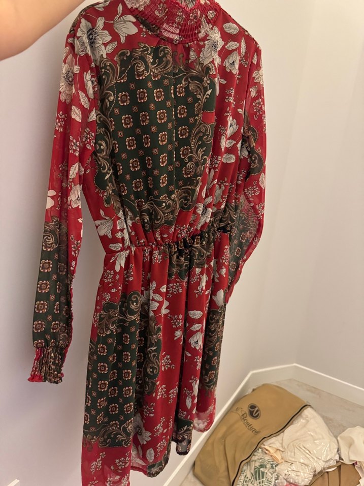 Bordo renkli, yüksek yakalı ve uzun kollu, drapeli desenli uzun elbise. Bohem tarzı, rahat kesim ve romantik akşamlar için ideal.