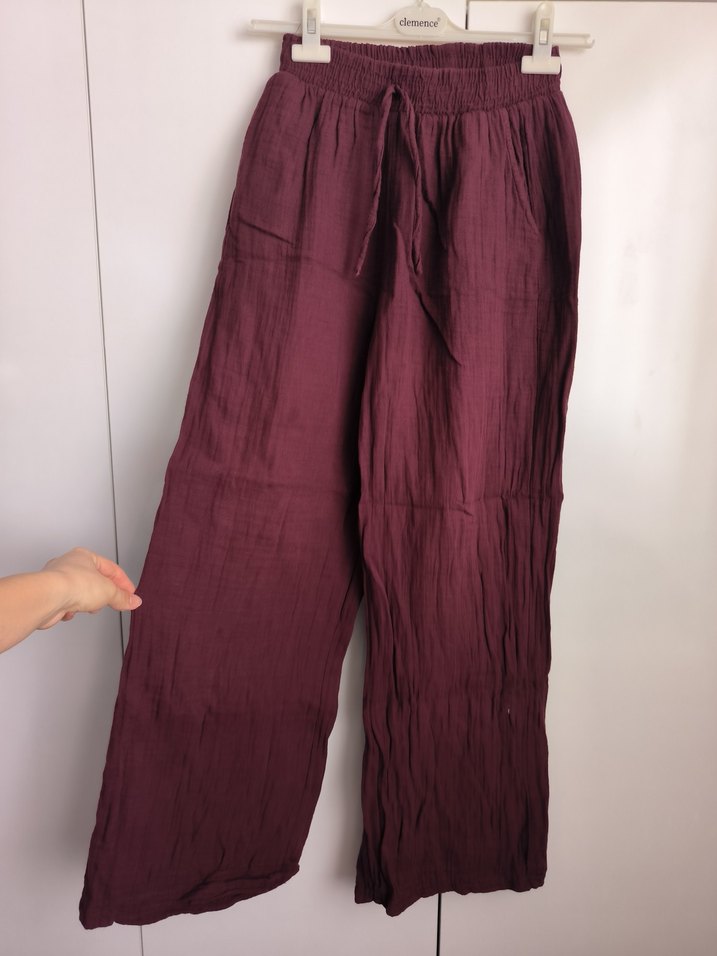 Bordo renkte, bol kesim müslin kumaştan, bağcıklı lastik bel detaylı pantolon.