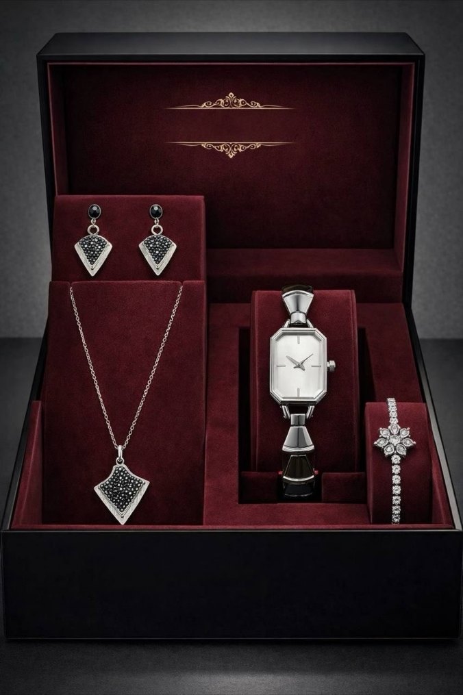 Gümüş renkli dikdörtgen saat, bordo boncuk detaylı kayış ve uyumlu küpe, kolye ile bileklikten oluşan klasik modern kadın takı seti. Bordo kadife kutuda.