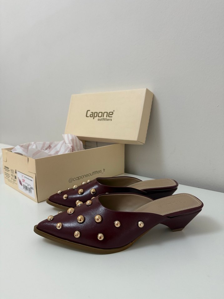 Bordo renkli, boncuk detaylı ve blok topuklu kadın terlik. Baskılı kauçuk malzemeden üretilmiş, ofis için uygun şık ve rahat bir tasarım. Capone markası.