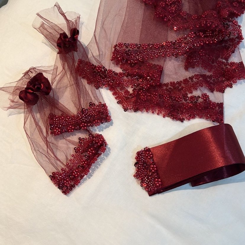 Bordo renkte, boncuk işlemeli yumuşak ve şeffaf kumaştan yapılmış, bohem ve gösterişli düğün aksesuarı.