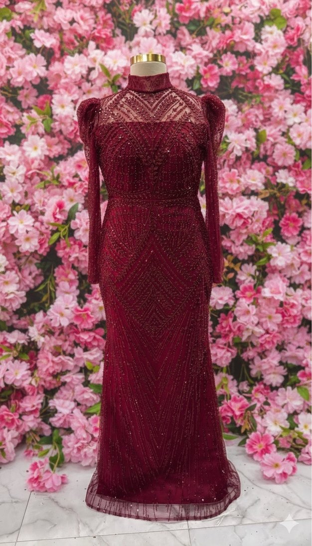 Bordo renkli, yüksek yakalı, uzun kollu ve boncuk işlemeli uzun abiye elbise. Düzenli kesim ve bohem tarzıyla düğünler için uygun. Kiralıktır Kiralık fiyatı: 2000 tldir