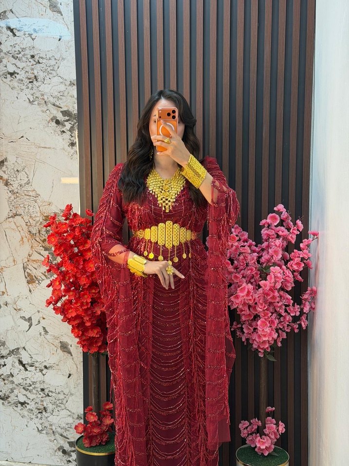 Bordo renk, boncuk işlemeli etnik desenlere sahip, uzun kollu ve tekne yaka bohem tarzda uzun elbise. Sentetik kumaştan, bol kesim, düğün için uygun.