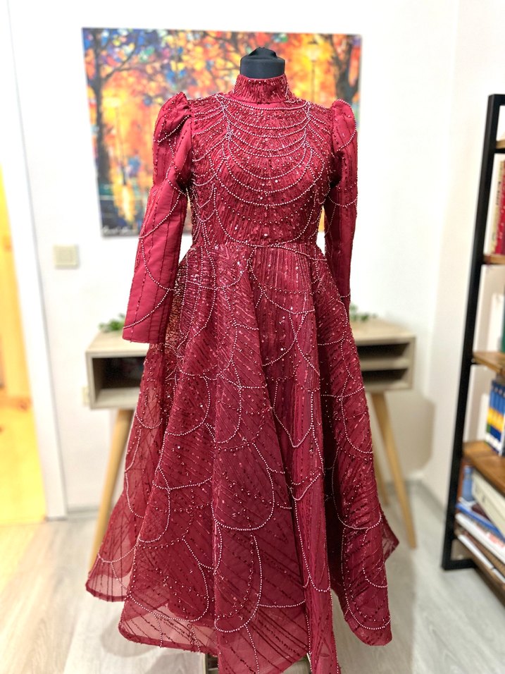 Bordo renkli, boncuk işlemeli ve nakış detaylı uzun henna elbisesi, yüksek yakalı ve uzun kolludur. Düzenli kesimi ve parlak görünümü ile düğünler için uygundur.