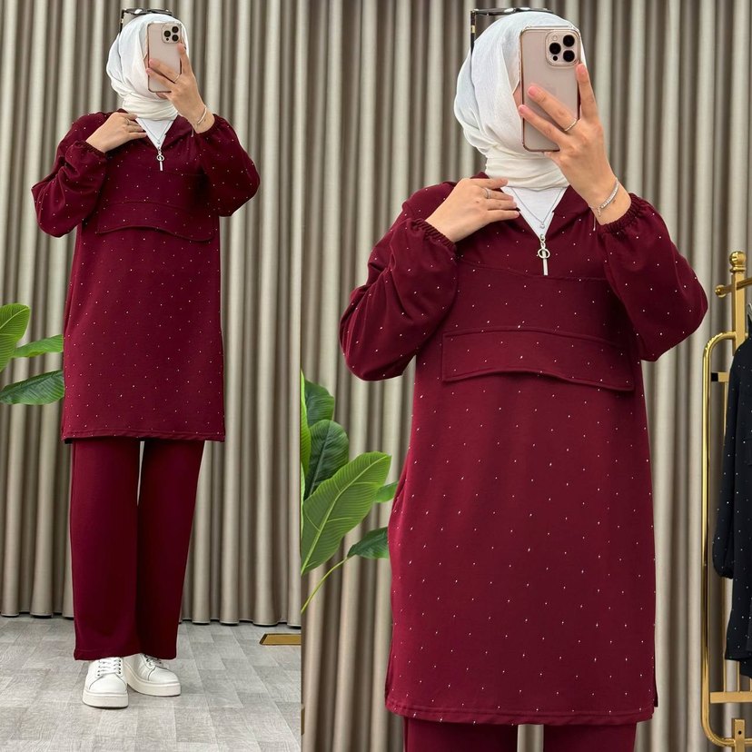 Bordo renkli, boncuk işlemeli ve nakış detaylı uzun kollu, salaş kesim midi boy kadın eşofman takımı. Günlük kullanıma uygun, mütevazı ve rahat bir tarza sahiptir.