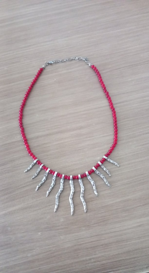 Kısa ve bordo boncuklardan oluşan bu kolye, çubuk şeklinde gümüş detaylara sahiptir. Canlı bordo boncukları ve benzersiz tasarımıyla bohem tarzı için uygundur.