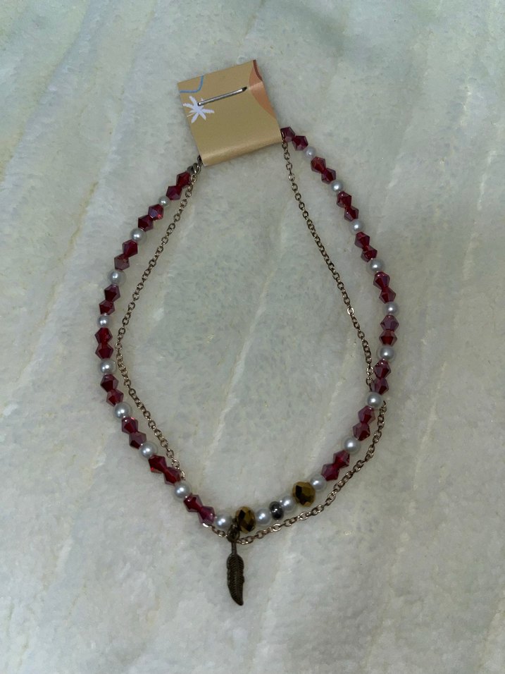 Bordo boncuklar ve küçük tüy figürlü zincirden oluşan bohem tarzda midi uzunlukta kolye. Günlük kullanıma uygun.