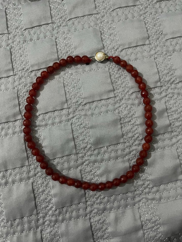 Bordo boncuklardan oluşan, midi uzunlukta, yuvarlak klipsli, günlük kullanıma uygun bohem tarzda kolye.