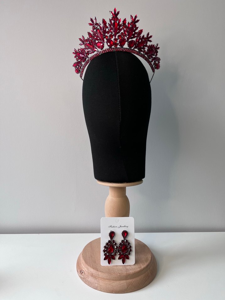 Bordo renkli, boncuk işlemeli gotik taç ve uyumlu küpe seti, triko malzemeden yapılmıştır ve avangart moda tutkunları için uygundur.