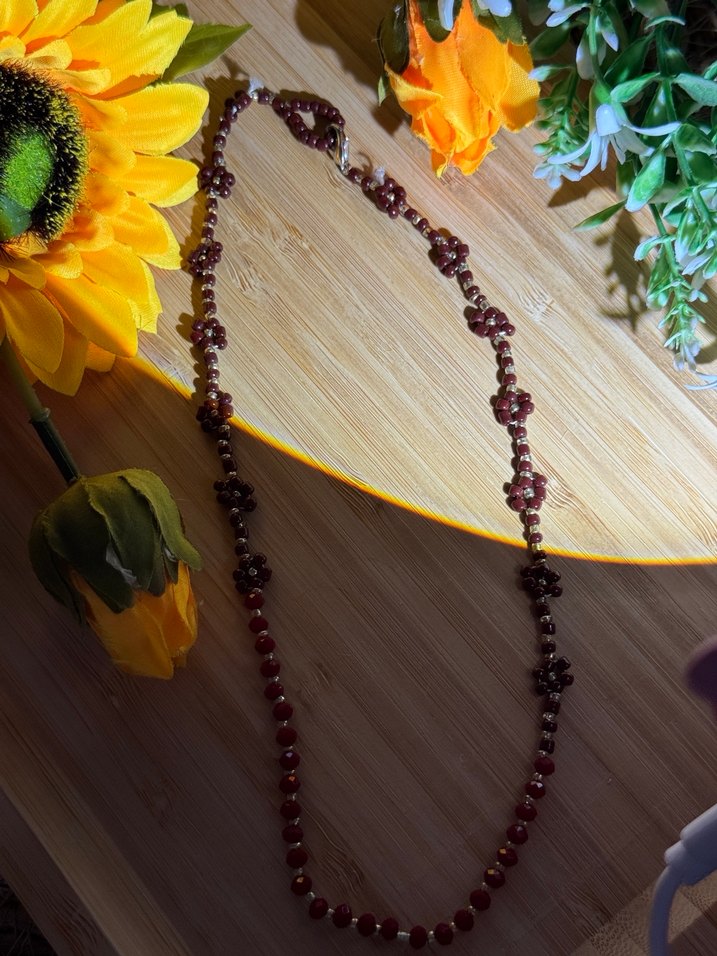 Bordo renkli, boncuk detaylı uzun kolye, bohem ve minimalist çiçek desenli, günlük kullanım için uygundur.