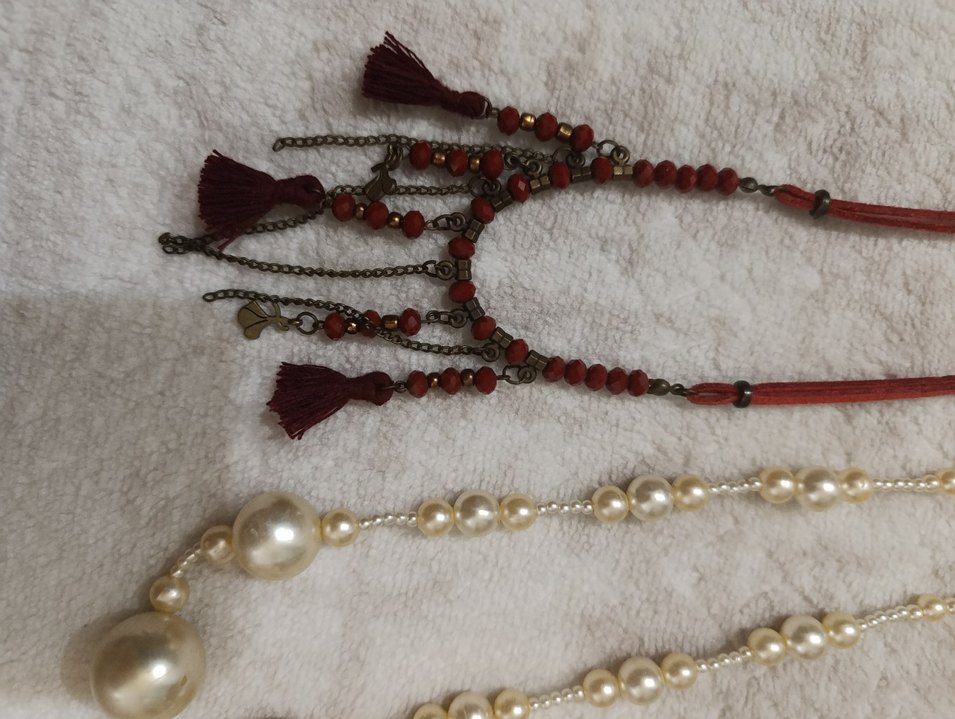 Bordo renkli, boncuklu ve işlemeli detaylara sahip uzun kolye, püsküllerle bohem tarzı yansıtıyor.