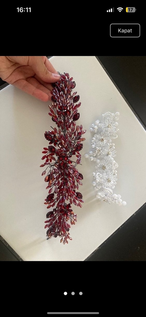 Bordo renkli örgüden yapılmış, çok sayıda boncukla süslenmiş bohem tarzda saç aksesuarı. ✨ ve beyaz nikah tacı bir kere kullanıldı ikisini birlikte satıyorum