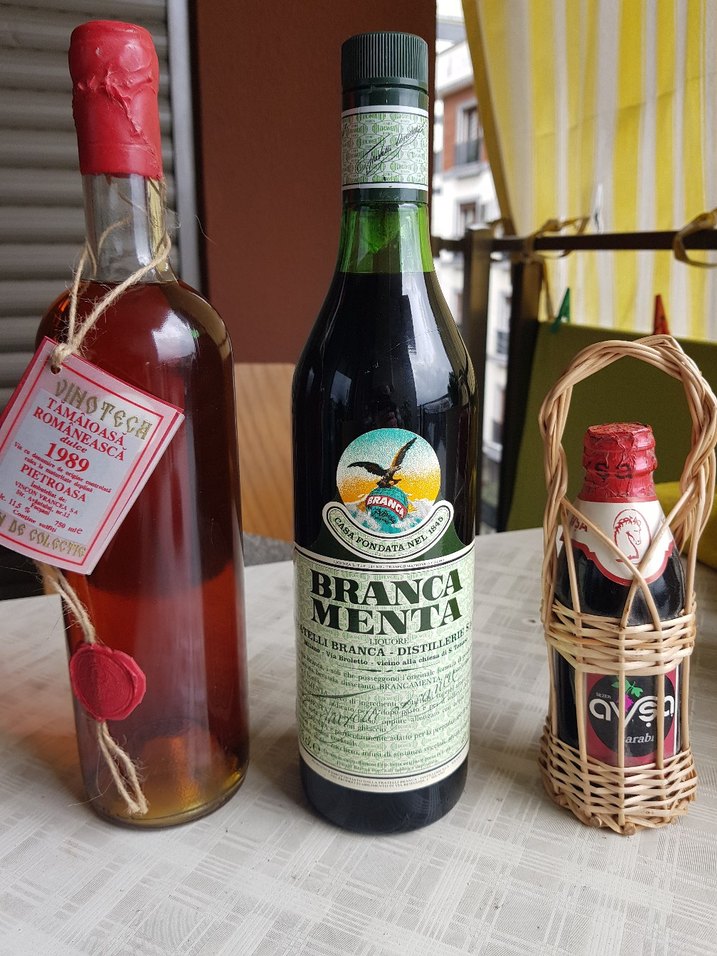 Bordo renkli Branca Menta şişesi, renkli Yeni Yıl ürünü olarak vintage bir görünüme sahip. Etikette 'BRANCA' yazıyor.