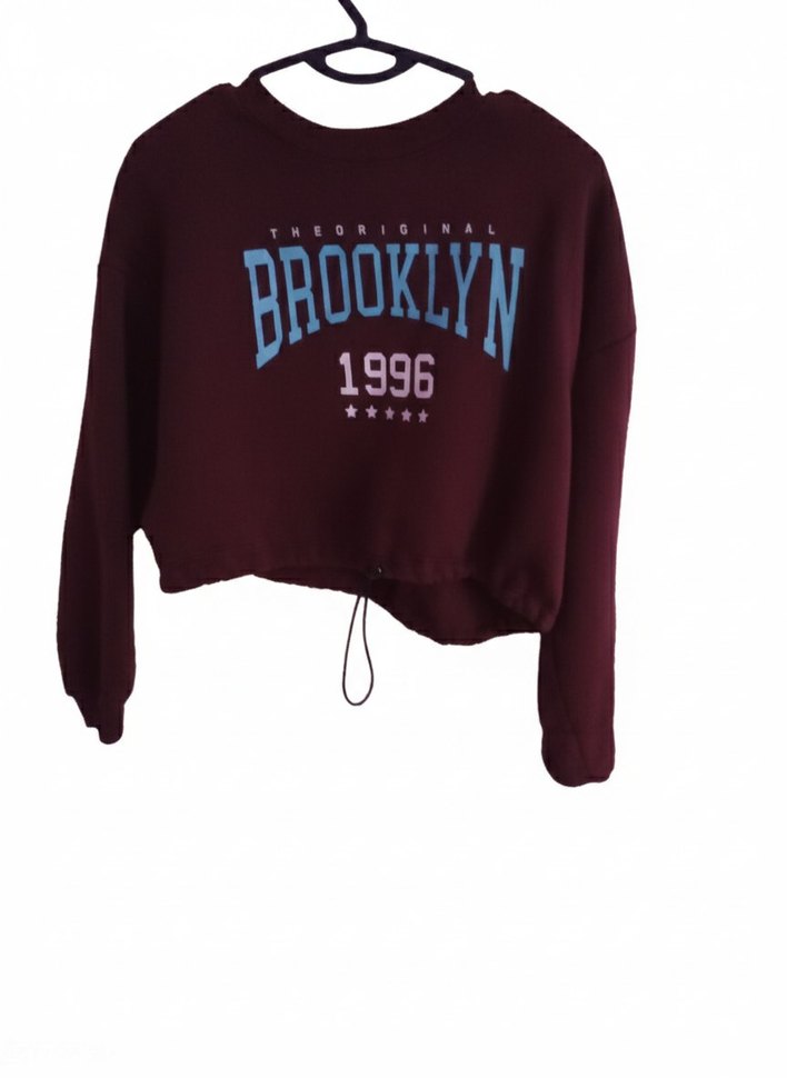Bordo renkte, uzun kollu, yuvarlak yaka ve bol kesim örme kumaştan sweatshirt. Brooklyn ve 1996 baskılı, trend sokak stili için uygundur.