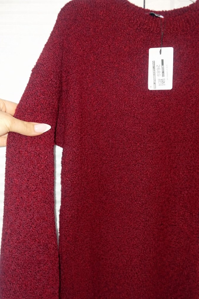 Bordo kadın buklet elbise, bisiklet yakalı ve uzun kolludur. Yünü dokunmuş, yumuşak ve rahat, bol kesimli ve normal boydadır.