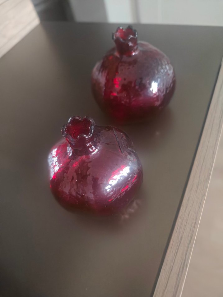 Parlak yüzeye sahip, koyu bordo renkte iki cam nar figürü.