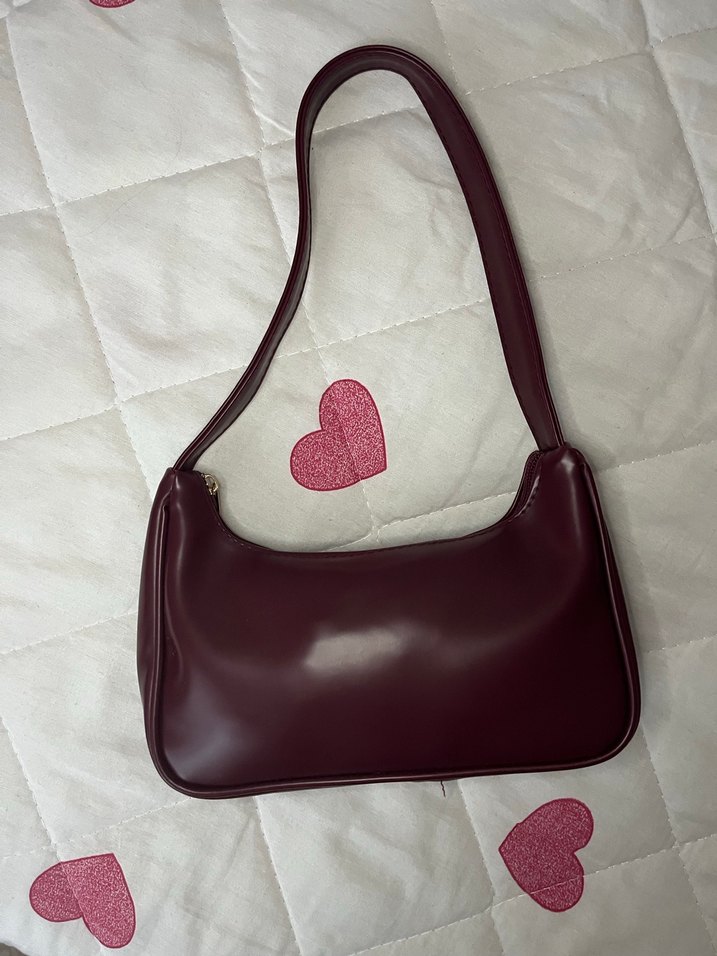 Bordo deri, sade desensiz kadın omuz çantası. Tek askılı ve günlük kullanım için şık, zahmetsiz bir görünüm sunar. Sokak modasına uygundur. tek ürün fiyatıdır profilden ikisine ulaşabilirsiniz