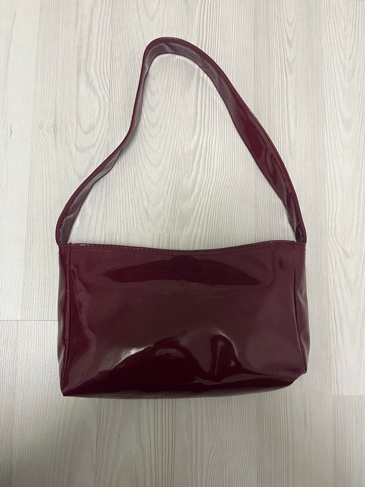 Bordo parlak deri malzemeden tasarlanmış sade ve desensiz kadın omuz çantası. Minimalist stil, sokak modası ve günlük kullanım için uygundur.