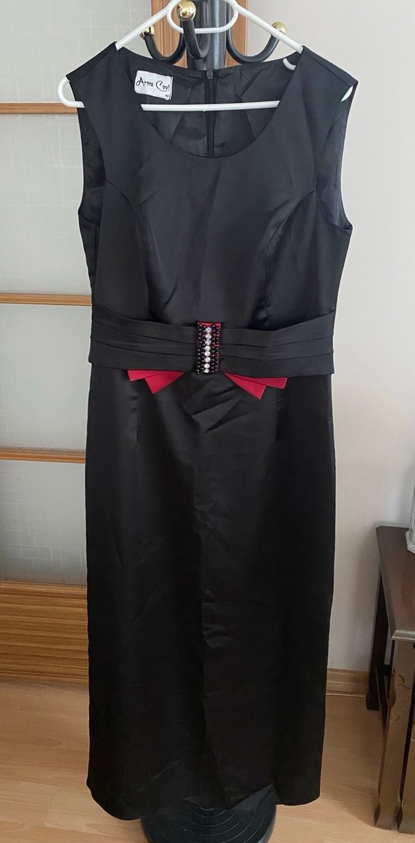 Bordo renkli, saten görünümlü uzun kadın takımı; yaka detaylı, askılı kollu ve kemerli, gotik tarzda, özel davetlerde giyilebilir bir üründür