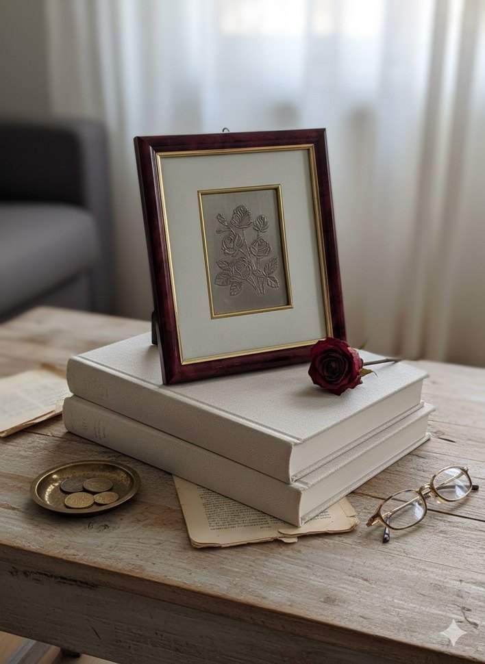 Bordo çerçeveli, gri çiçek desenli tablo, ahşap masa üzerinde kitaplar ve aksesuarlarla sergileniyor. 26/22 cm. 1990 lardan kalma, cok iyi durumda. MAUN ÇERÇEVELİ
