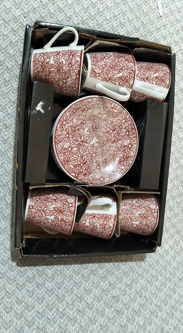 Altı adet bordo renkli, çiçek desenli kahve fincanı ve tabak seti. Şık ve kullanışlı bir sunum sağlar. ☕kutusu yok hiç kullanılmadı