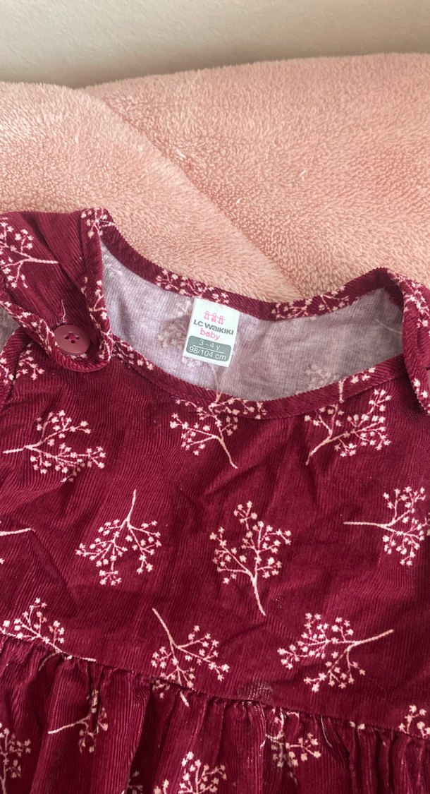 Bordo renkli, sıfır kollu, düğmeli, çiçek desenli pamuklu kadife kumaştan kız çocuk elbisesi